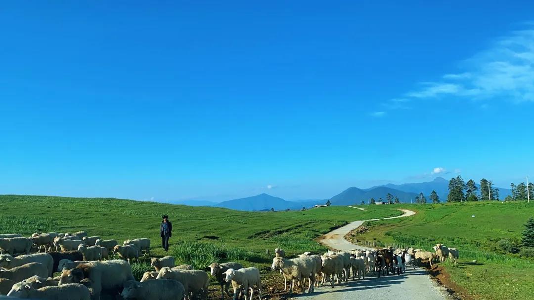 “咩咩咩……”一位老爺爺趕著羊群緩緩走來,機(jī)靈可愛的綿羊成群結(jié)隊(duì),沐浴著陽光,吮吸著青草的芳香,開始了它們一天的覓食之旅,一路向上,直至消失在草地與藍(lán)天的交界線。