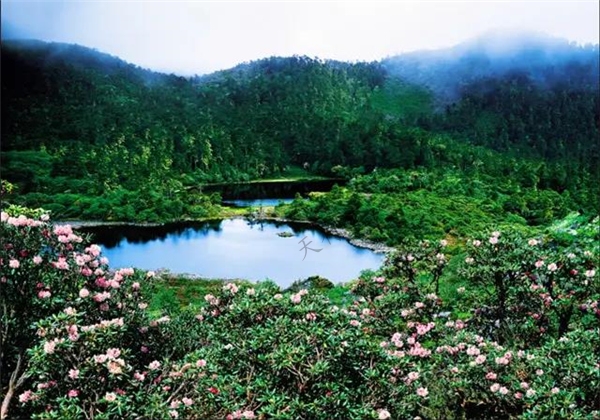 “九十九龍?zhí)丁逼鋵?shí)并非真有99個(gè)龍?zhí)?,而是在老君山主脊線北東側(cè)海拔3800米以上的山坳里,有數(shù)十個(gè)湖泊、沼澤,它們沿溪流成串分布,成為老君山一道亮麗的風(fēng)景線。杜鵑也許不是老君山所獨(dú)有的,但這些冰蝕湖卻是少見的。老君山的美,其實(shí)除了杜鵑,被杜鵑所包圍著的這些湖泊、溪流更是這片神奇土地的靈秀之所在。它們藏而不露,全部深深地隱于原始密林之中,如非親眼所見,誰也不相信,這高山之巔,這茫茫林海之中,會(huì)有星落棋布的龍?zhí)?。古林參天,枝桿虬曲的林海中,龍?zhí)稛o處不在,這兒一泓,那兒一潭,形狀各異,一個(gè)連接一個(gè)。湖水幽深神秘,在陽光、藍(lán)天和花木的映照下呈現(xiàn)出各種絢麗色彩。潭水是春天的融雪和夏季的降雨,清澈冰冷。湖水溢出后,匯成小溪,形成瀑布,集為小河,穿越原始森林,奔向金沙江、瀾滄江!