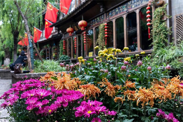 有人說(shuō)秋天的麗江古城是藍(lán)色、紅色和金色交織的,藍(lán)色是天空,紅色是隨處招展的五星紅旗,金色的則是一年一度滿城盛開(kāi)的菊花。300個(gè)品種的35132盆菊花將古城裝扮一新,五彩斑斕的景象令人沉醉。