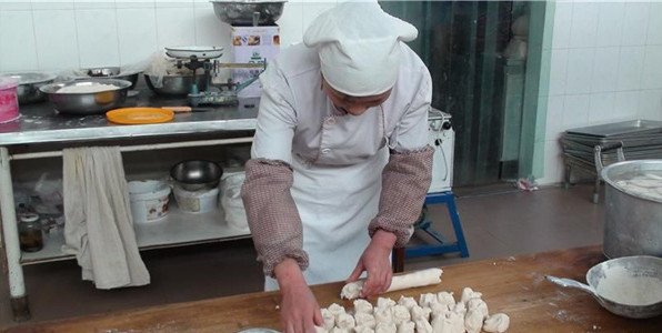 2、制面團:將精面粉與去除雜質的鮮豬板油使勁揉搓成均勻的面團。