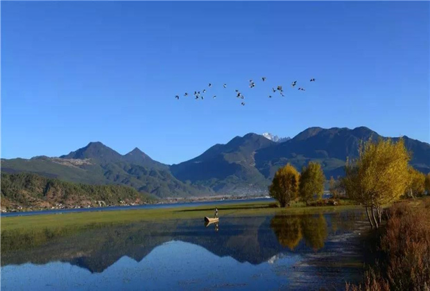 漫步拉市海濕地公園,藍(lán)天白云下,濕地里的小花和綠草在習(xí)習(xí)微風(fēng)中搖蕩,一梭魚船穿過花叢,水波輕輕地拍打水草,聲如天籟。