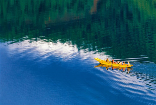 湖水波瀾不驚,光滑如鏡,遠(yuǎn)看是一片深藍(lán)幽光,近看可見清澈水底的水草,青山白云的倒影與湖水融為一體,這就是萬物叢生的感覺吧。