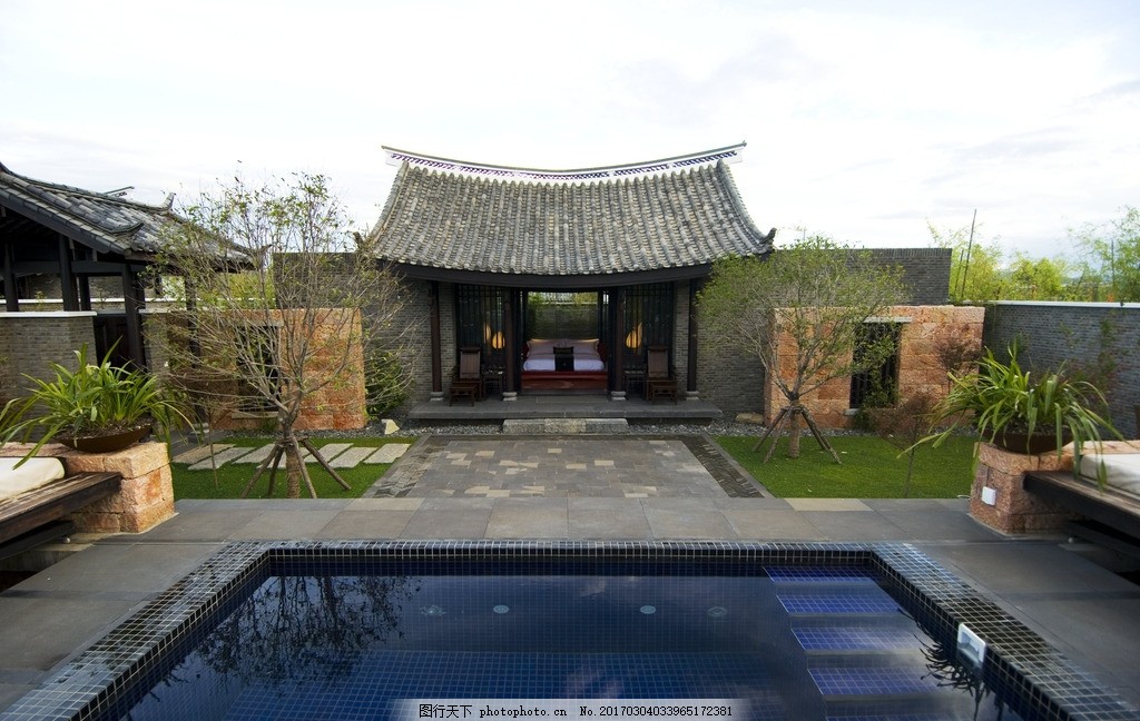 別墅套房開(kāi)放式的空間格局不僅再現(xiàn)了納西民居靈活多變的建筑精神,也將生活空間與天地景色融合為一,從而構(gòu)筑起人與自然最真切的聯(lián)系。用玻璃作為隔斷的沐浴空間與庭院相連顯得十分通透。浴缸則用云南盛產(chǎn)的大理石材制作而成,其穩(wěn)重的材質(zhì)與輕盈的玻璃相搭配,帶來(lái)空間的靈動(dòng)感覺(jué)。悅榕莊的庭院呈對(duì)稱格局展開(kāi)在天地懷抱之下,充滿民族氣息的建筑元素,搭配巨大的圓形沐浴池,完全敞開(kāi)在自然之中,讓人感受不到任何建筑帶來(lái)的禁錮。