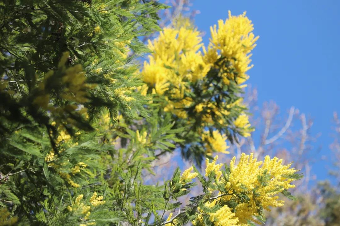 穿梭于銀荊樹下,那一簇簇的小黃花隨著視線變得清晰了起來(lái)。毛茸茸的像一群小黃人在樹枝上跳著歡快的舞蹈。耳邊似乎響起了周杰倫的《晴天》:故事的小黃花,從出生那年就飄著......